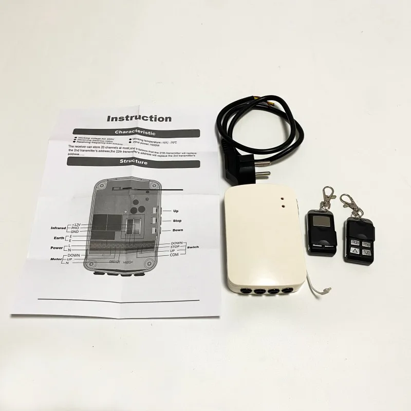Quando a porta rolante desce, ela irá parar se o interruptor fotoelétrico detectar obstáculos, neste momento, a porta pode subir se pressionarmos o botão UP no receptor ou controle remoto, mas não pode descer se pressionarmos qualquer botão para baixo até que os obstáculos sejam removidos
